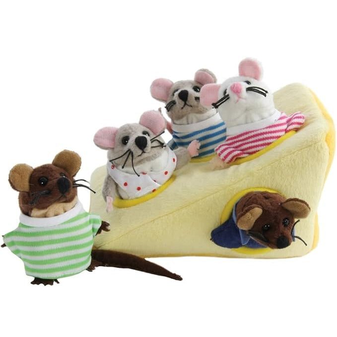 This adorable Mice in Cheese Hide-Aways Puppet set comes alive with five mice finger puppets who live in their own holes in a block of cheese! Each mouse is dressed in their own tiny outfits for added play value. Let imaginations run wild and create enchanting stories with this versatile set in vibrant colours and soft materials, providing hours of interactive play value and makes a fantastic gift.